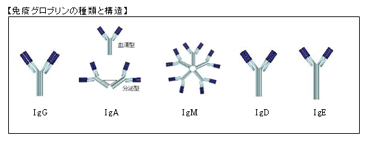 免疫グロブリンには、IgG、IgA、IgM、IgD、IgEの5種類があり、それぞれの分子量、その働く場所・時期にも違いがあります。これら5種類の免疫グロブリンの基本的な形はY字型をしています。